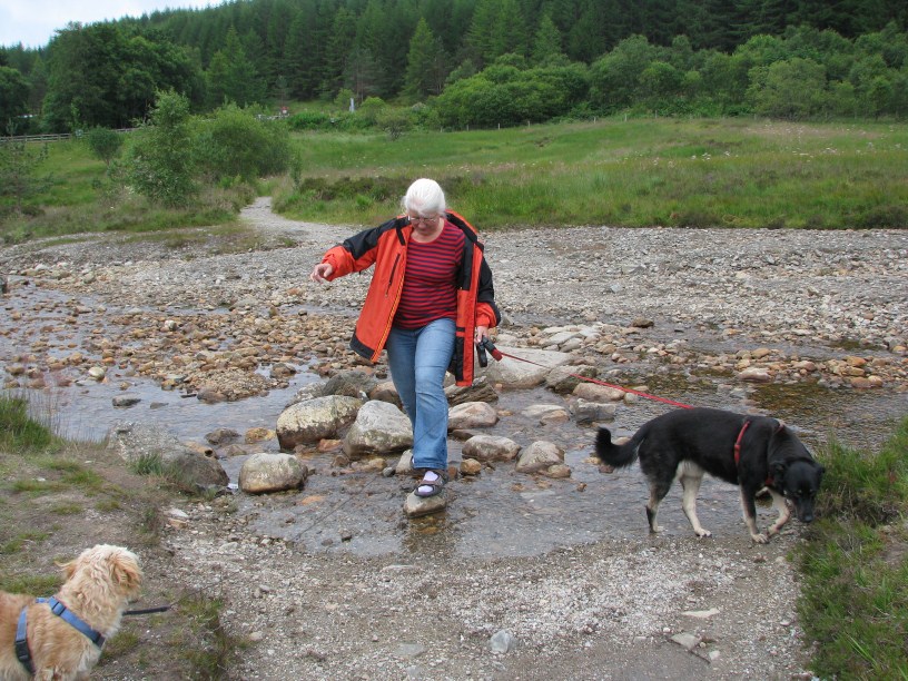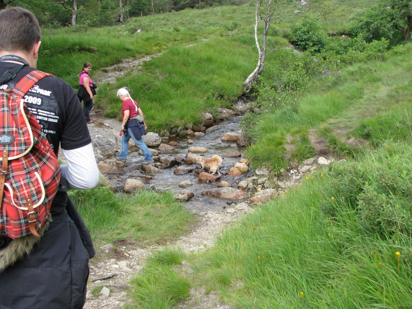 Aber auch unser kurzer Rundweg von etwa 2 km führt uns schon über Stock und Stein, mitten durch einen Bachlauf und dann zurück durch Tyndrum zum Zeltplatz.