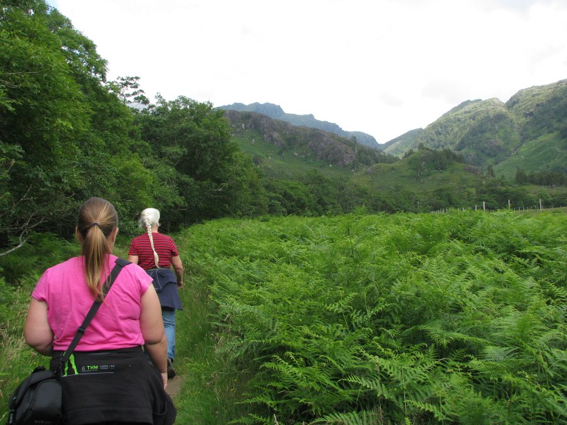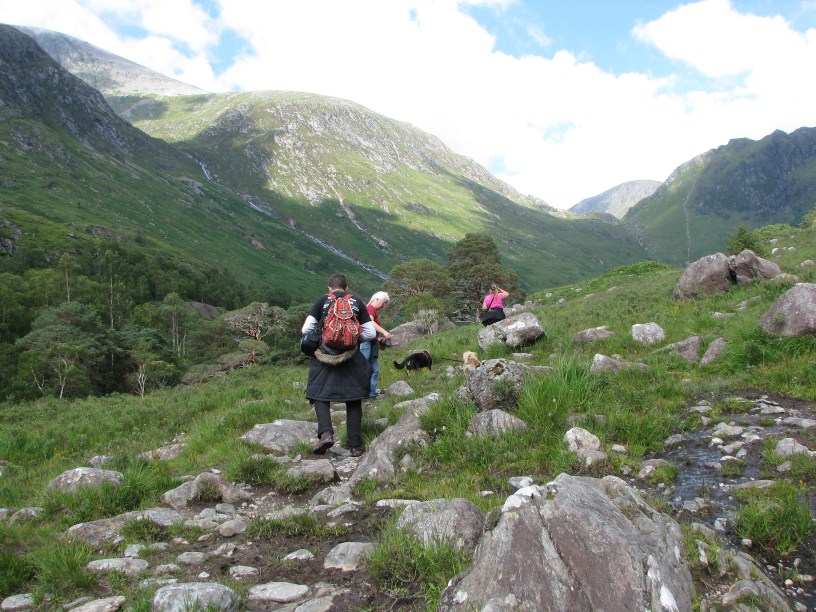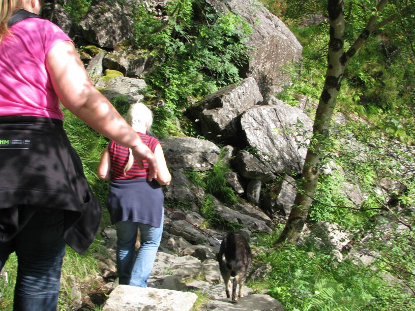 Dann wartet der Rückweg auf uns- er scheint zwar kürzer, aber die Füße wollen nicht mehr so recht. Und dann kommt uns auch noch ein älteres Pärchen entgegen und fragt wie weit es noch sei – sie waren heute schon auf dem Ben Nevis und wollen sich nicht mehr allzusehr anstrengen, aber die paar Schritte bis zum Wasserfall schaffen sie bestimmt noch – das frustet! Deshalb muss sich Gisela rächen und gibt als Auskunft, dass man noch sehr viel klettern muss, da wären sie fast umgekehrt – aber nur fast – DOPPELFRUST!
