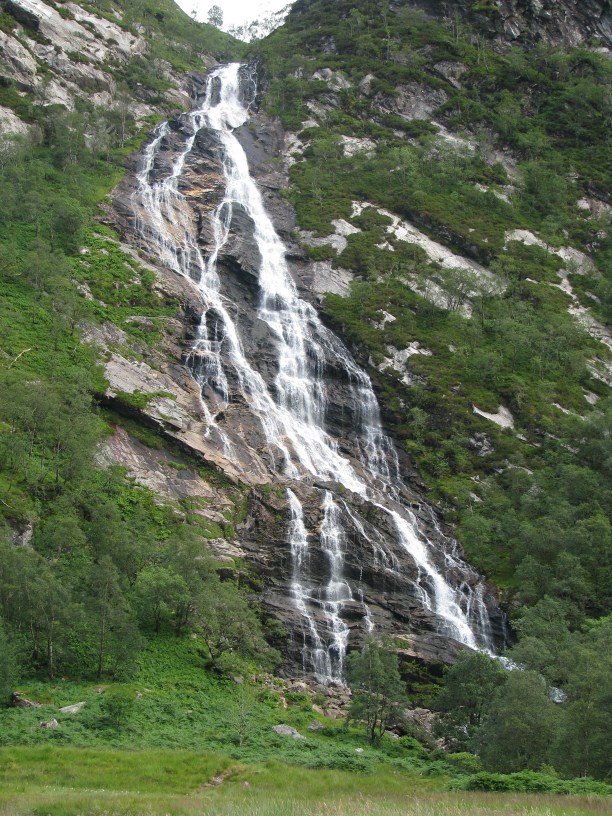 Das stimmt auch, aber es sind  nicht der Steall Falls, sondern die Lower Falls und wir dürfen doch noch etwas laufen. Rechts neben dem Wasserlauf führt der Weg in die Schottischen Berge des Glen Nevis. Links von uns der Ben Nevis, den wir nicht besteigen möchten – das überfordert mindestens unsere Hunde.