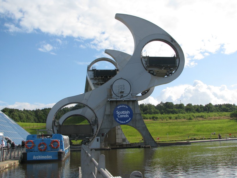 Am Falkirk Wheel ist vor allem Gisela ganz brav, obwohl bei dem vielen Wasser ein Feueralarm kaum ein Problem gewesen wäre. Wir bestaunen diese schottische Art eines Schiffshebewerks, bei dem das Schiff in eine wassergefüllte ‚Gondel‘ fährt und dann ein Wheel mit zwei dieser Gondeln so gedreht wird, dass die obere Gondel nach unten und die untere nach oben fährt.