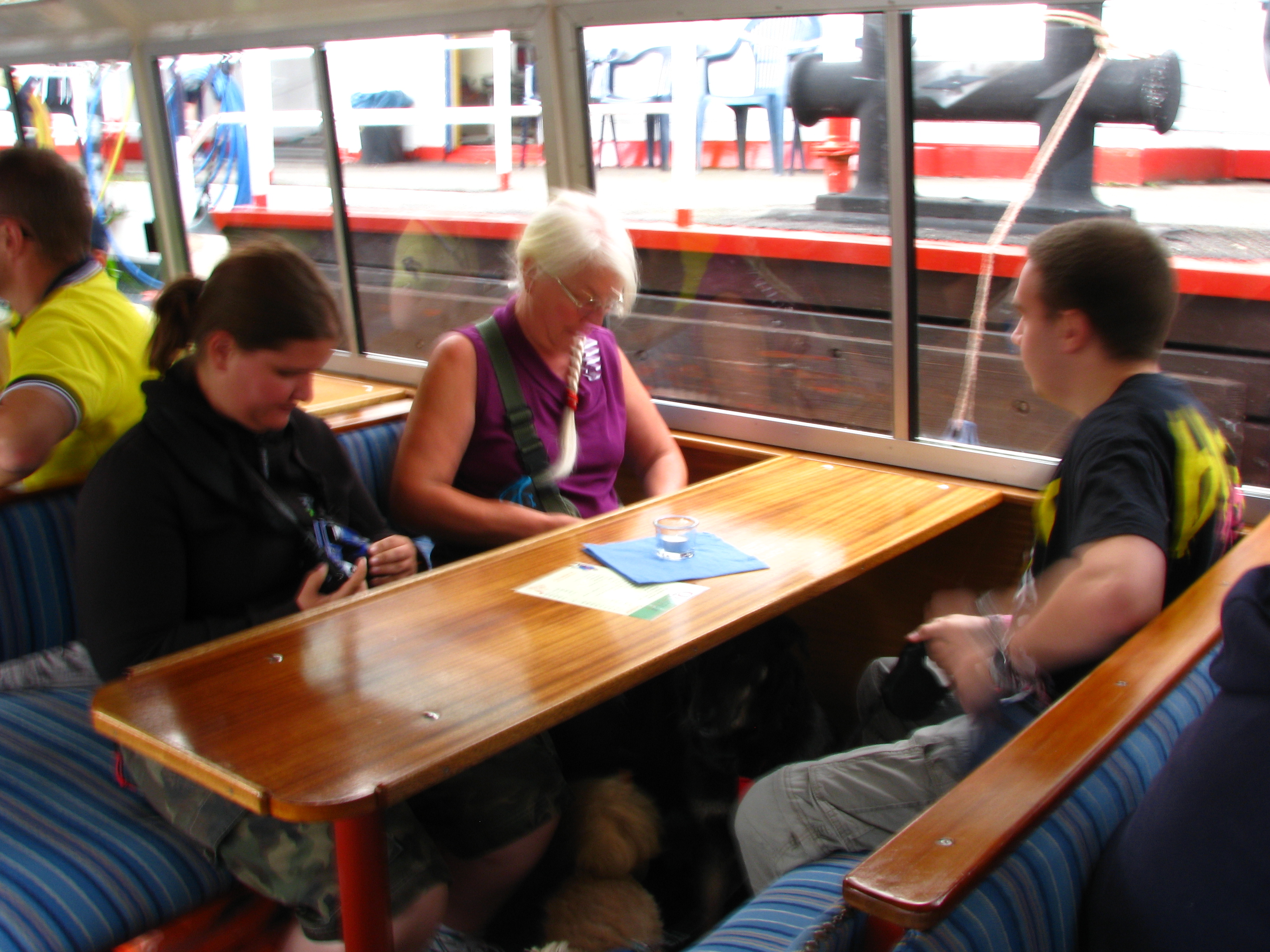 IMG_4595Wir sind noch nicht ganz angekommen, da wird der Plan schon geändert. Schiffstour, eine Stunde Rundfahrt mit den bekanntesten Sehenswürdigkeiten, Start SOFORT. Wir sind gespannt, kaufen Karten und gehen alle begeistert an Bord. Na ja, fast alle sind begeistert. Mara muss getragen werden und Lotta ist mehr als misstrauisch – sie stakst mit wackeligen Beinen aufs Schiff und ist froh, als sie sich unter den Tisch legen und alle Gefahren vergessen kann. Der Kapitän ist gleichzeitig Stadtführer und kommentiert informativ und humorig die Sehenswürdigkeiten, an denen wir in aller Ruhe vorbeifahren. Wir sehen mehr von Lübeck als erwartet und haben auch noch einiges dazu gelernt.