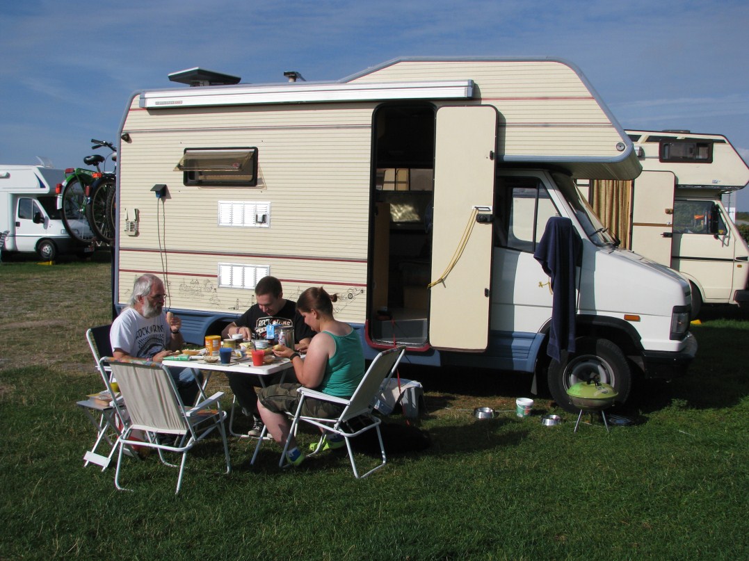 Außer uns stehen noch etliche weitere Wohnmobile auf dem 18,50€-Platz, das gleich neben uns ist mindestens 1 1/2m länger und einiges höher als unsere Romana. Das ist auch sehr praktisch, denn es gibt uns Schatten für unser Frühstück. Nach einer kleinen Auseinandersetzung wer im Schatten und wer in der Sonne sitzt und ob jemand, der den Tisch so blöd hingestellte hat überhaupt weiter mitfahren darf, werden die klecker-gefährdeten Kaffeebecher vom Tisch genommen und der ganze Tisch in den Schatten getragen. Jetzt sind alle zufrieden, setzen sich und das großen Wohnmobil fährt mitsamt unserem Frühstücks-Schatten davon.