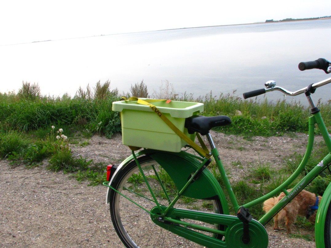 en wir mit den Fahrrädern… aber halt, erst mal Essen kochen, nach dem Schwimmen haben wir ja Hunger. Dann starten wir mit den Fahrrädern… ja, diesmal wirklich. Mara bekommt einen ganz speziellen Hundekorb, Lotta darf laufen. Ja, DARF. Sie freut sich und kann es kaum erwarten. Noch mehr freut sie sich, als wir unterwegs einen Foto-Stop machen und dort das Wasser so flach ist, dass Sie darin herum toben kann.