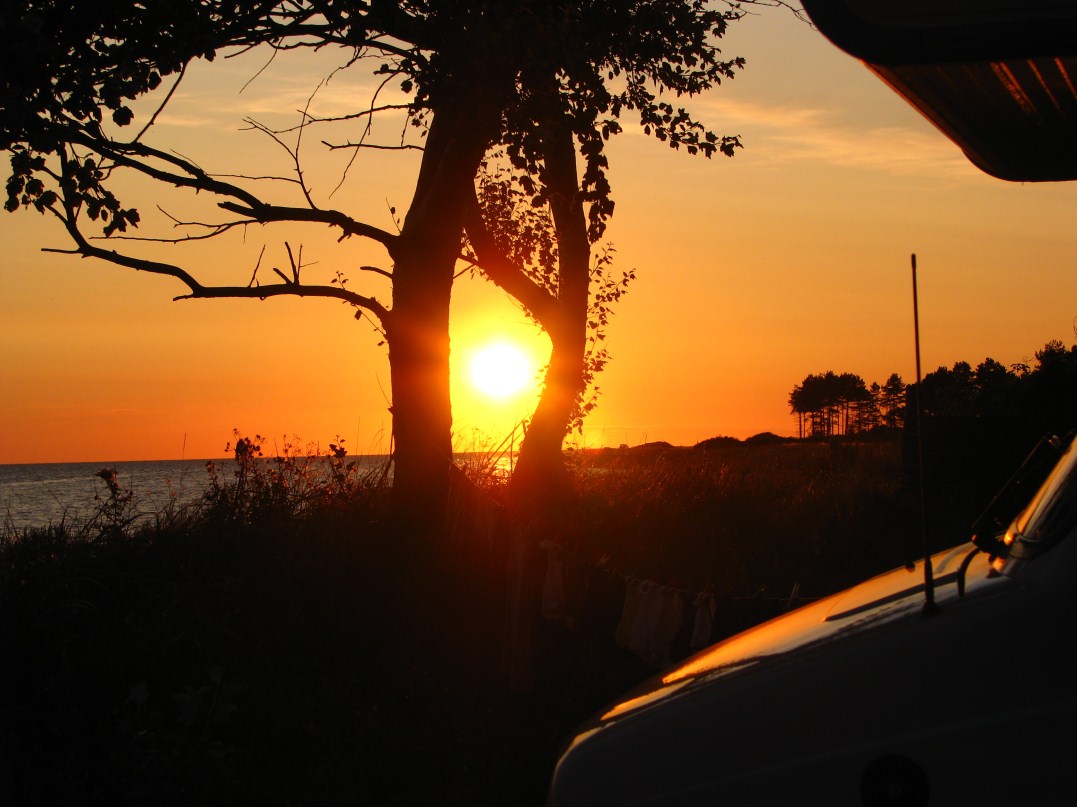 und 5m Entfernung vom Wasser der Ostsee getrennt. Nach dem Abendessen sehen wir die Sonne direkt von unserem Platz aus im Meer versinken – Südseefeeling bei bestem Wetter und tollem Übernachtungsplatz. Da stört es auch kaum, dass ich den Text heute erst mal vorschreiben muss, um dann zum allgemeinen Grillplatz zu laufen und dort alles hoch zu laden.