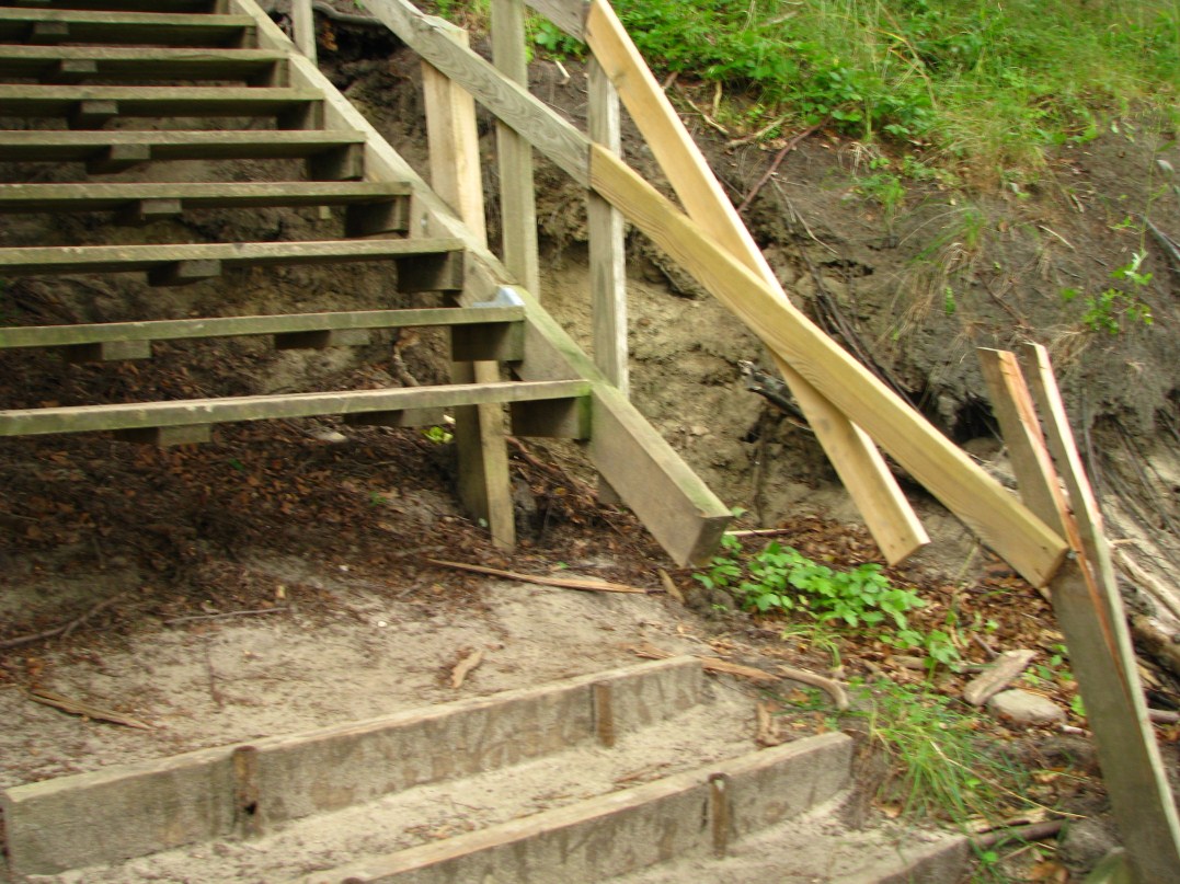 Seite angeschraubt, die andere Seite war wohl richtig geplant aber während der Bauarbeiten ist entweder das Geländer geschrumpft oder die Treppe länger geworden, jedenfalls reichte es nicht mehr bis zum nächsten Pfosten. Aber der Abstieg lohnt sich. Unten gibt es einen Kiesstrand mit alten abgestorbenen Baumstämmen und eine sehr gute