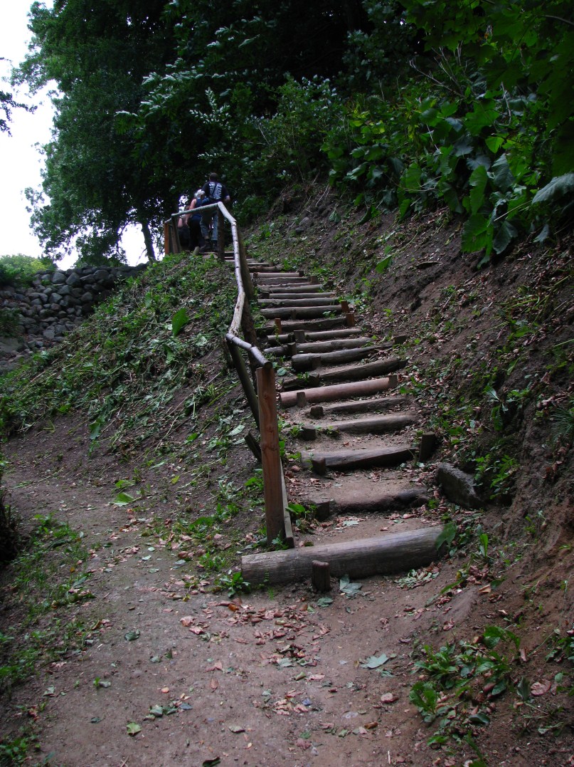 Der Weg dorthin entpuppt sich als eine Folge von Treppen und Wegen und Treppen und Treppen. Damit uns der Weg nicht zu langweilig wird, hat man die Treppen wohl extra etwas baufällig gestaltet. Teils fehlt mal eine Stufe, bei einem etwas längeren Schritt habe ich das Geländer komplett in der Hand, teils sind Geländer auch nur an einer