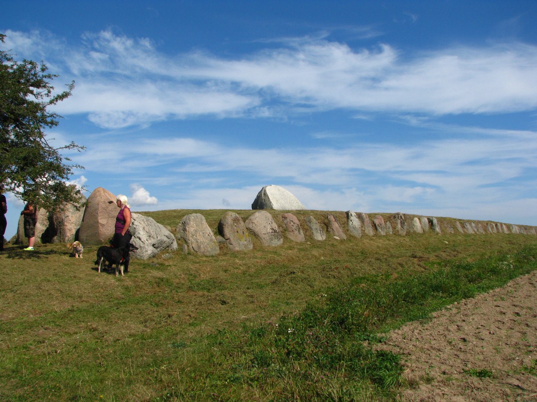 Gegen halb sechs starten wir dann zu Campingplatzsuche. Am nächsten Morgen sehen wir beim Hundespaziergang, dass hier gleich in der Nähe 72 Hügelgräber sind. Da wir heute nach Nykøbing wollen, nutzen wir die Gelegenheit, bei einer ausgedehnten Rundwanderung zwischen den 5000 Jahre alten Gräbern unsere Hunde auszuführen. In Nykøbing können sie dann im Wohnmobil bleiben. Die kleine Wanderung dauert gut eine Stunde und führt an teils beeindruckenden Steinhügeln vorbei, teils sieht man nur einen Hügel, oft mit einem uralten Baum darauf. Aber die Hunde sind zufrieden und wir können einen kleine Shopping-Tour einmal ganz ohne Leinenzwang machen.