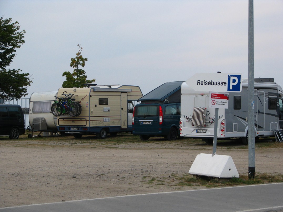 htung, Abbiegen in kleinste Sträßchen, die auf einer 2m kürzeren aber völlig verwirrenden Route zum Ziel führt oder Abbiegeanweisungen, 100m nach der Abzweigung, rote Ampeln – egal – das ist doch Fahrspaß pur! Leider kommen wir dann doch noch vor dem Dunkelwerden am Ziel an und unser Spaß hat ein Ende. Immerhin ignoriert Gisela konsequent die Schilder auf dem Parkplatz, die für Wohnmobile die Plätze rechts vorgesehen haben. Den Platz links hatte sie sich schon von der Fähre aus ausgesucht und dass dort „Reisebusse“ steht, spielt keine Rolle. Zum Glück ist der noch frei, Gisela war schon völlig aufgeregt und hat das Navi noch viel mehr verflucht, weil der Platz besetzt sein könnte.