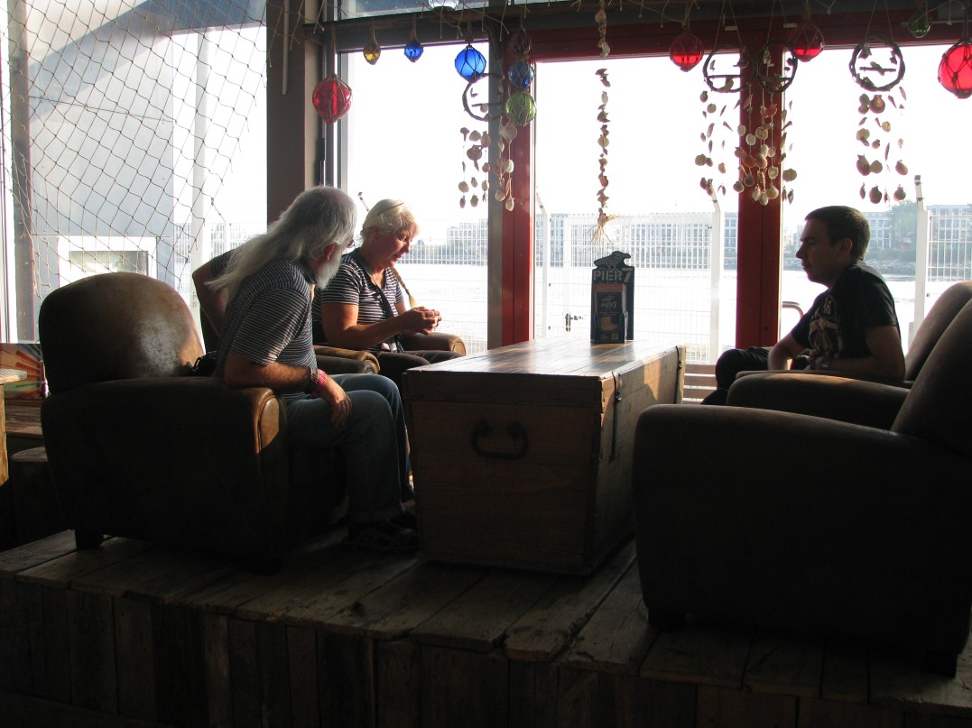 bringt uns einen Sonnenaufgang direkt vor uns, aus dem WoMo sichtbar, einen einstündigen Hundespaziergang und die Entdeckung eines Frühstücks für 2,50 pro Person mit Schatzkistentisch und Blick auf alle ein- und auslaufenden Schiffe. Auch unsere Fähre von gestern Abend ist dabei. Allerdings ist hier auch ein gro