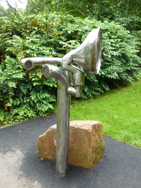 Boah, wie langweilig. Skulpturen… Aber dann der Hammer: das sind alles Klang-Skulpturen. Jede einzelne macht Musik. Man kann mit einem Klöppel wie auf einem Xylophon spielen und (mein Favorit) am Weg stehen zwei wie total verdrehte Trompeten aussehende Gebilde. Jedes davon hat eine Ohrmuschel, eine Sprechmuschel und einen großen Schalltrichter. Über den Weg hinweg können Gisela und ich uns flüsternd unterhalten.